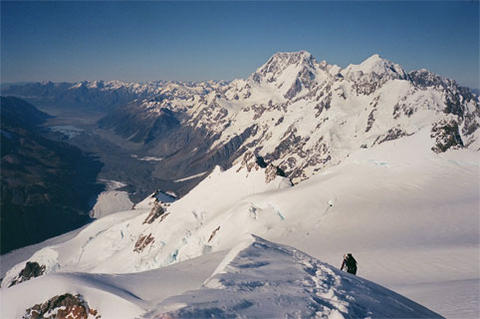 Alison summitting the Minarets with Mt. Cook and Mt. Tasman in the background.